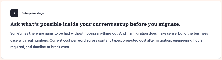 The migration math usually makes sense on paper. McKinsey estimates that technical debt accounts for 20 to 40 percent of a company’s entire technology estate, and localization infrastructure is no exception. New platform, lower per-word costs, faster turnaround, payback within a year. But enterprise teams have competing priorities. The current system works. It’s just not optimized. And the engineering hours to migrate are the same engineering hours that could go toward product features.